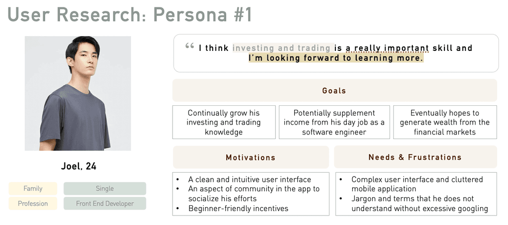 1. The primary user persona, Joel is the beginner retail investor and trader that is keen to learn and discover more about participating in the financial markets, as his profile is likely to represent the dominant market opportunity.