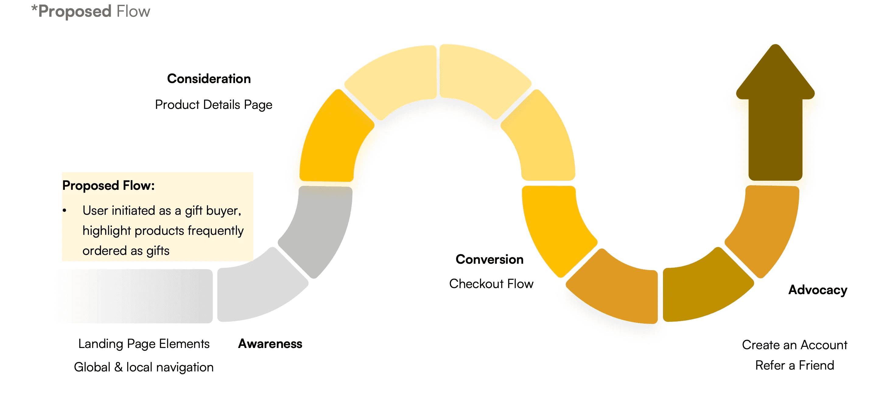 In the proposed user flow, a gift shopper is inducted into gift-shopping journey right from the start at the awareness stage, by having a gifting guide and questionnaire for the user to fill in for easier product discovery.