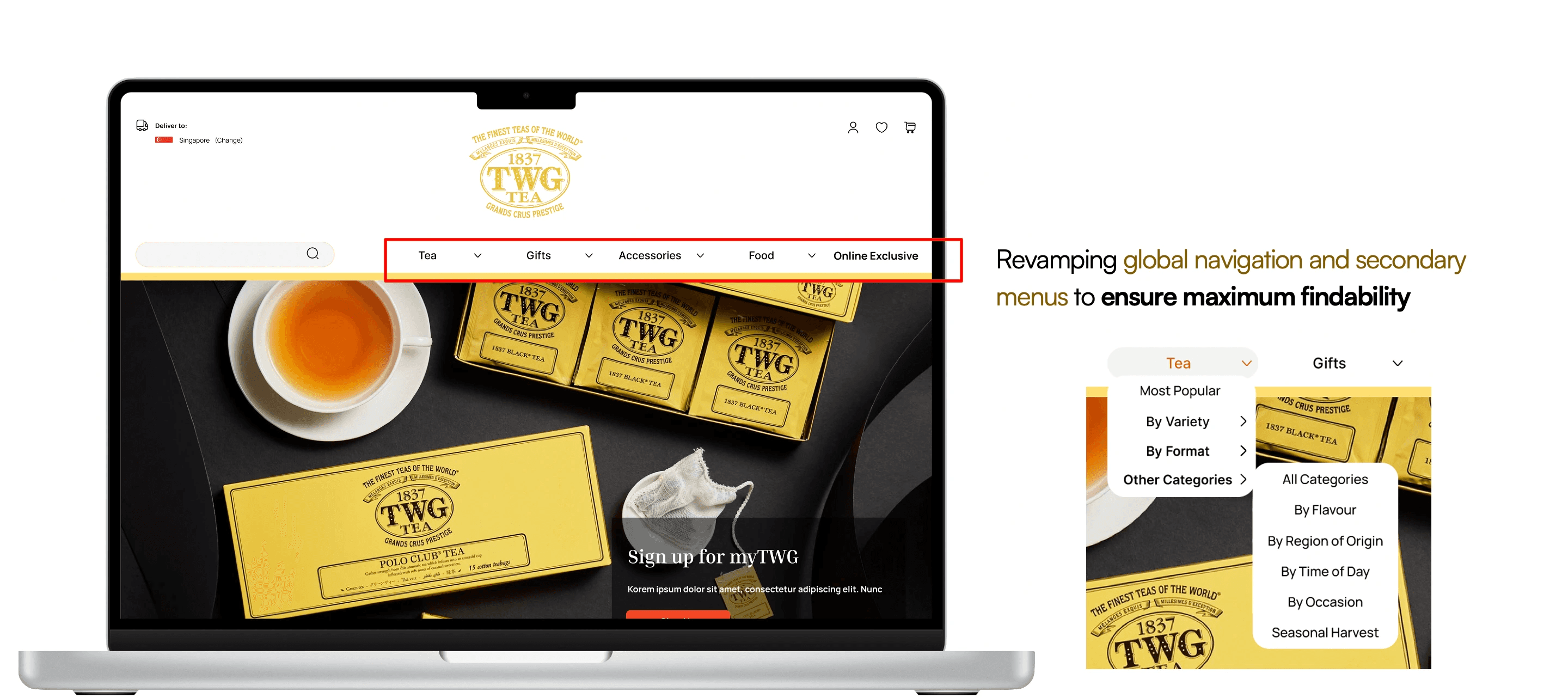 A proposed redesign of the e-commerce platform of specialty tea retailer TWG to improve the information architecture and purchasing experience for target users.