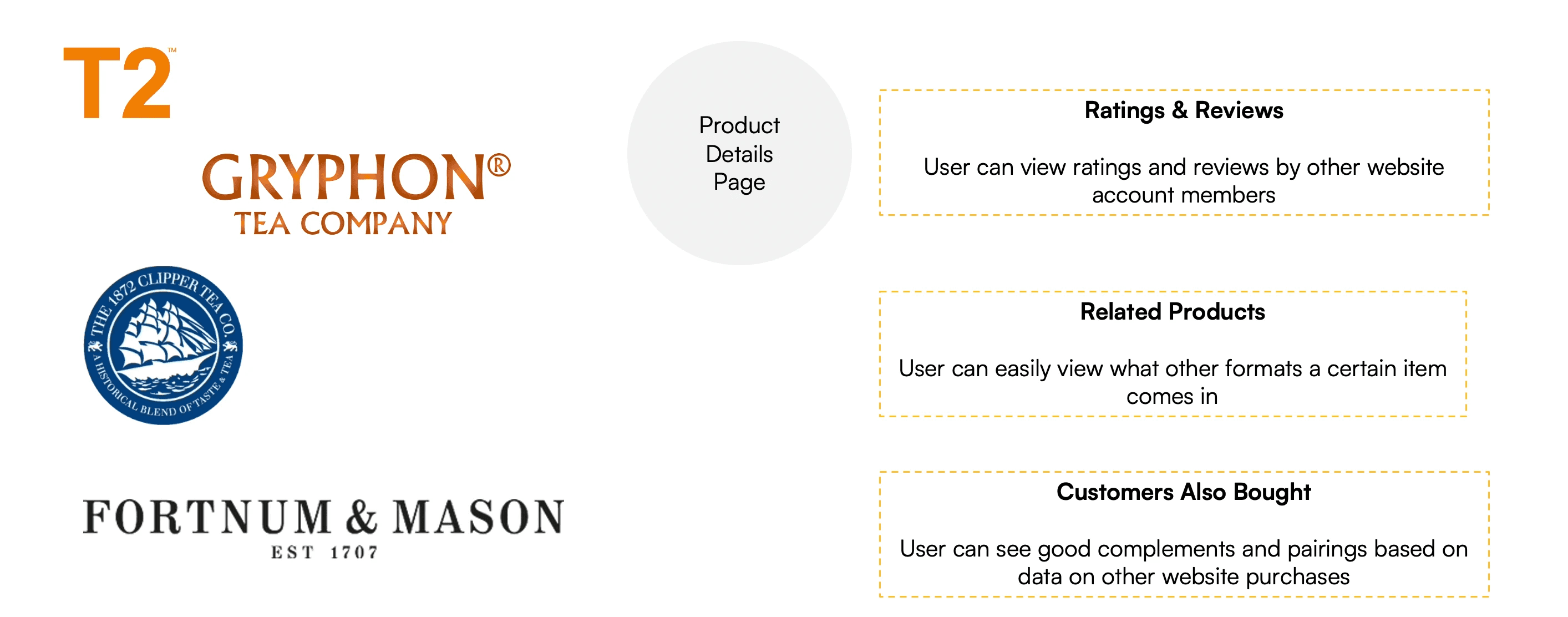 Similarly, using common practices among competitors as a benchmark and inspiration, the product details page was also redesigned to include sections such as 1) ratings and reviews 2) related products, to display variations of the same tea type 3) products bought by other customers, for the user to find good complements and pairings. Altogether, these aim to further enhance the product discovery process.