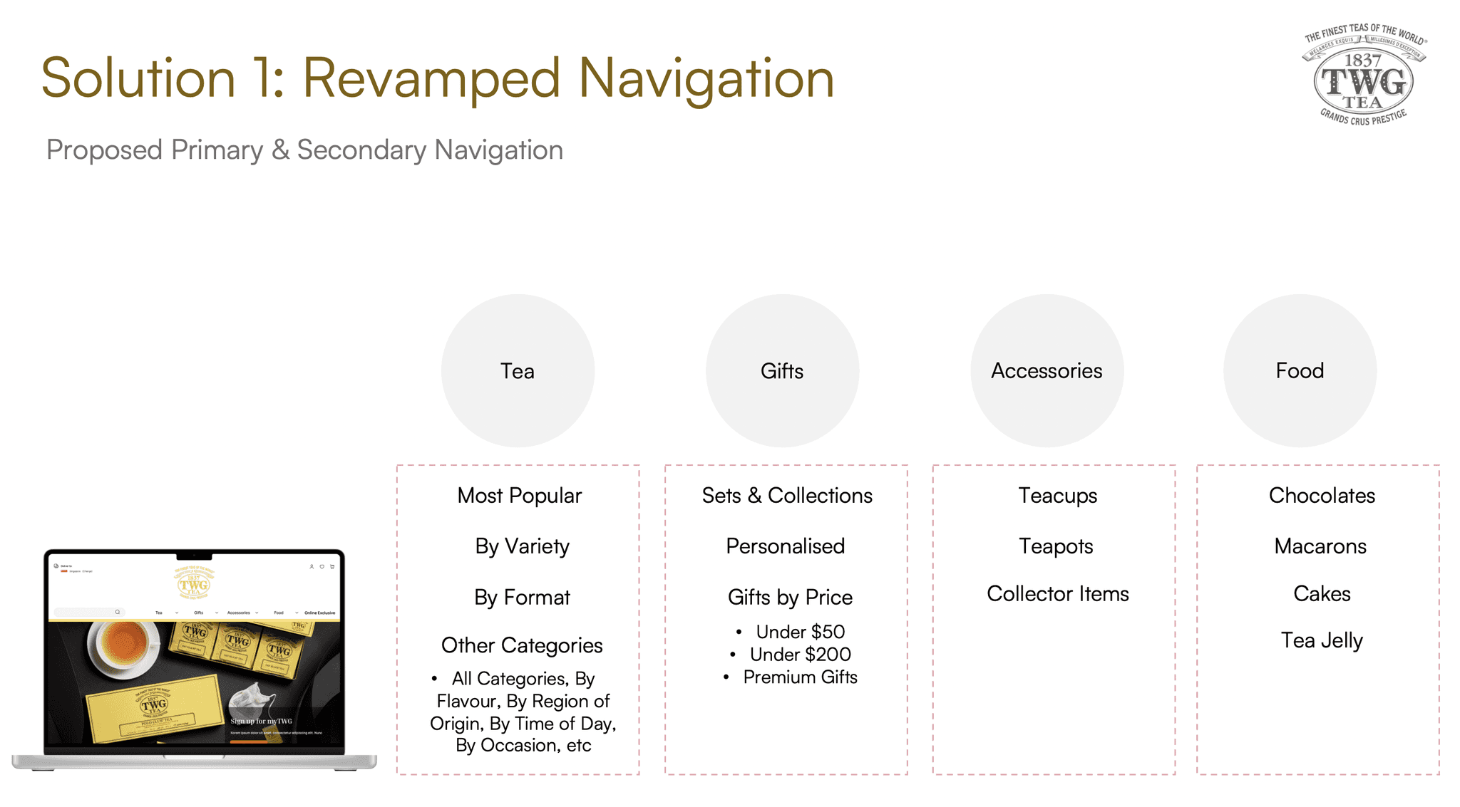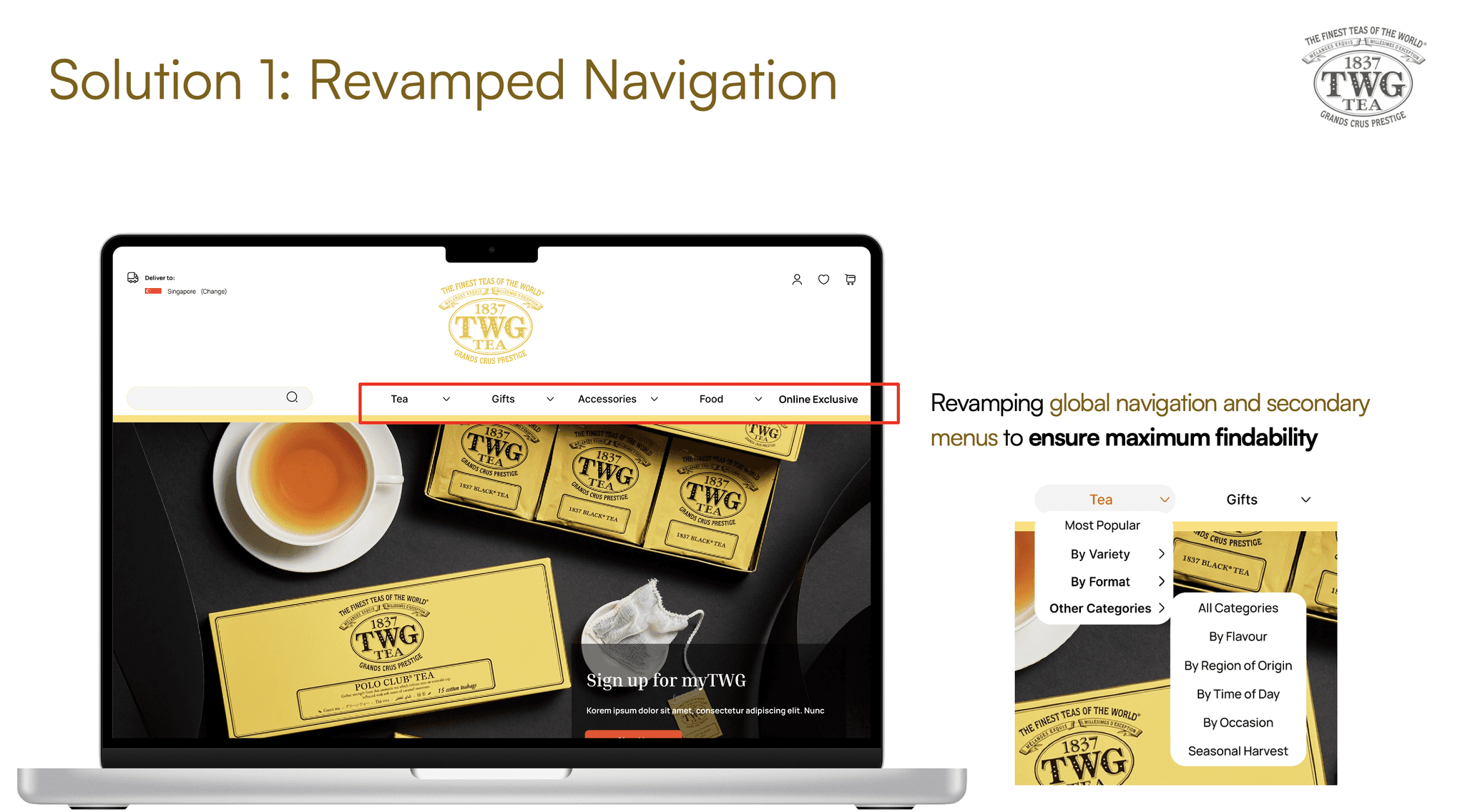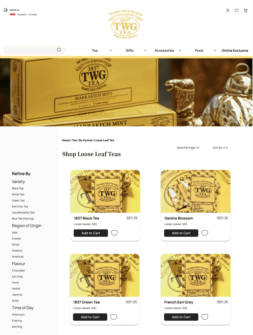 A proposed redesign of the e-commerce platform of specialty tea retailer TWG to improve the information architecture and purchasing experience for target users.