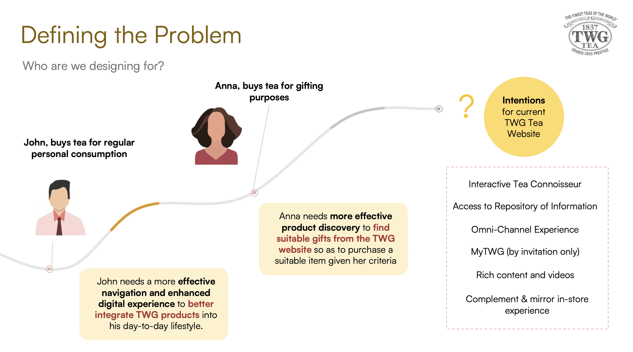 After identifying the problem space, I constructed a user journey map for both personas to identify opportunities for improvement along the ecosystem of interactions with TWG Tea.
