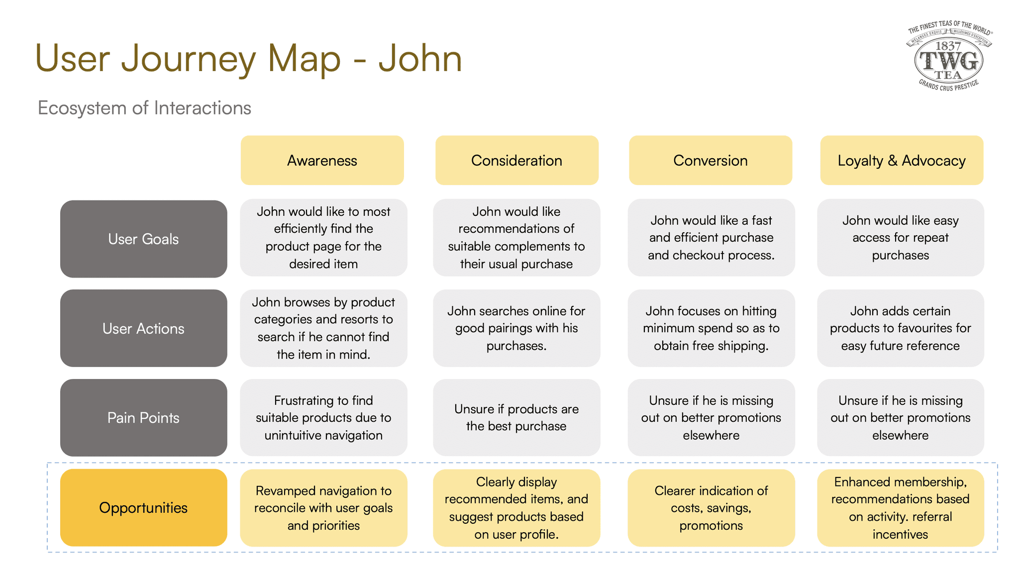 After identifying the problem space, I constructed a user journey map for both personas to identify opportunities for improvement along the entire journey of engagement with TWG Tea. Each stage of their interactions with the brand revealed specific pain points that had corresponding opportunities for design solutions.