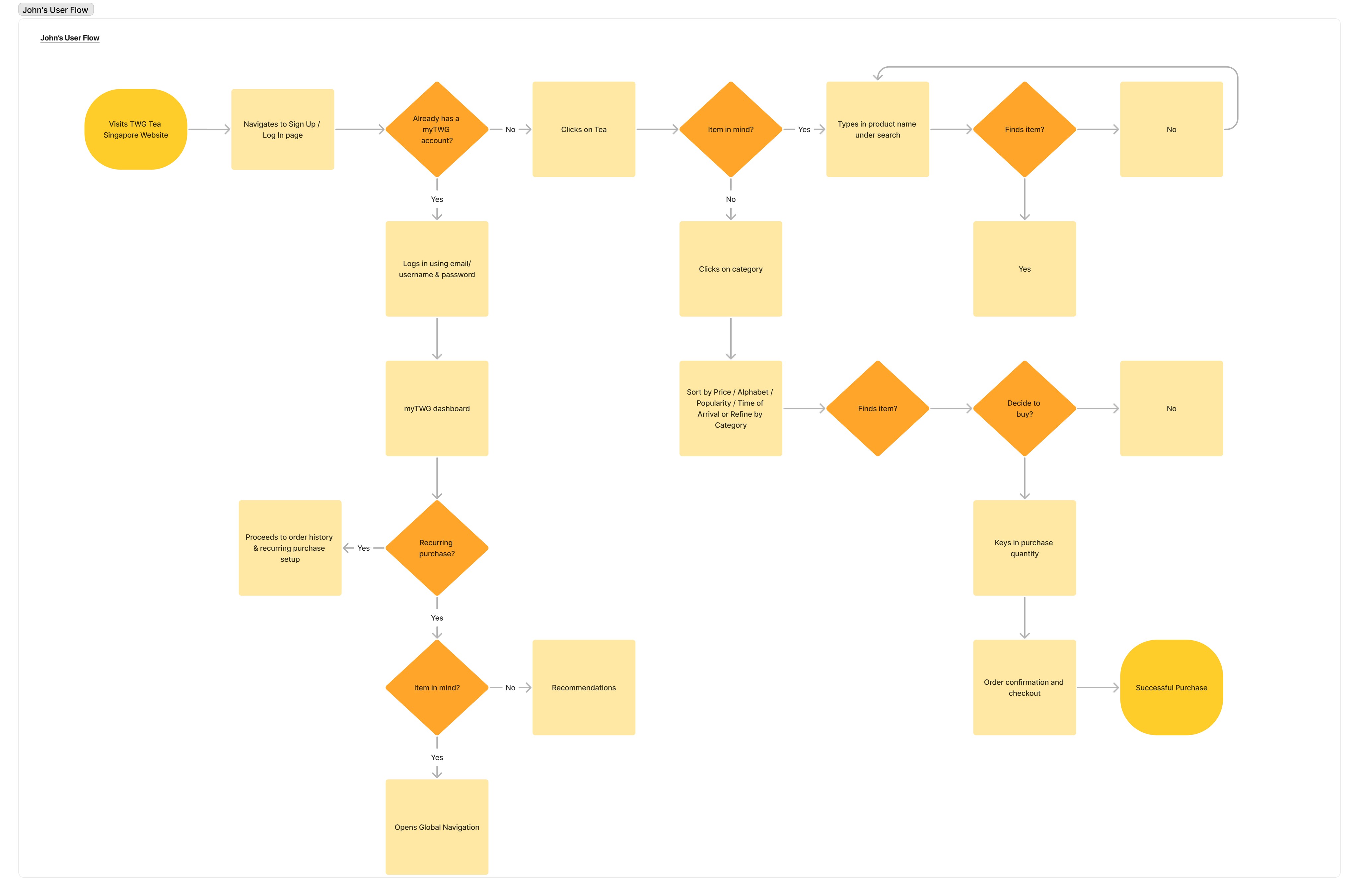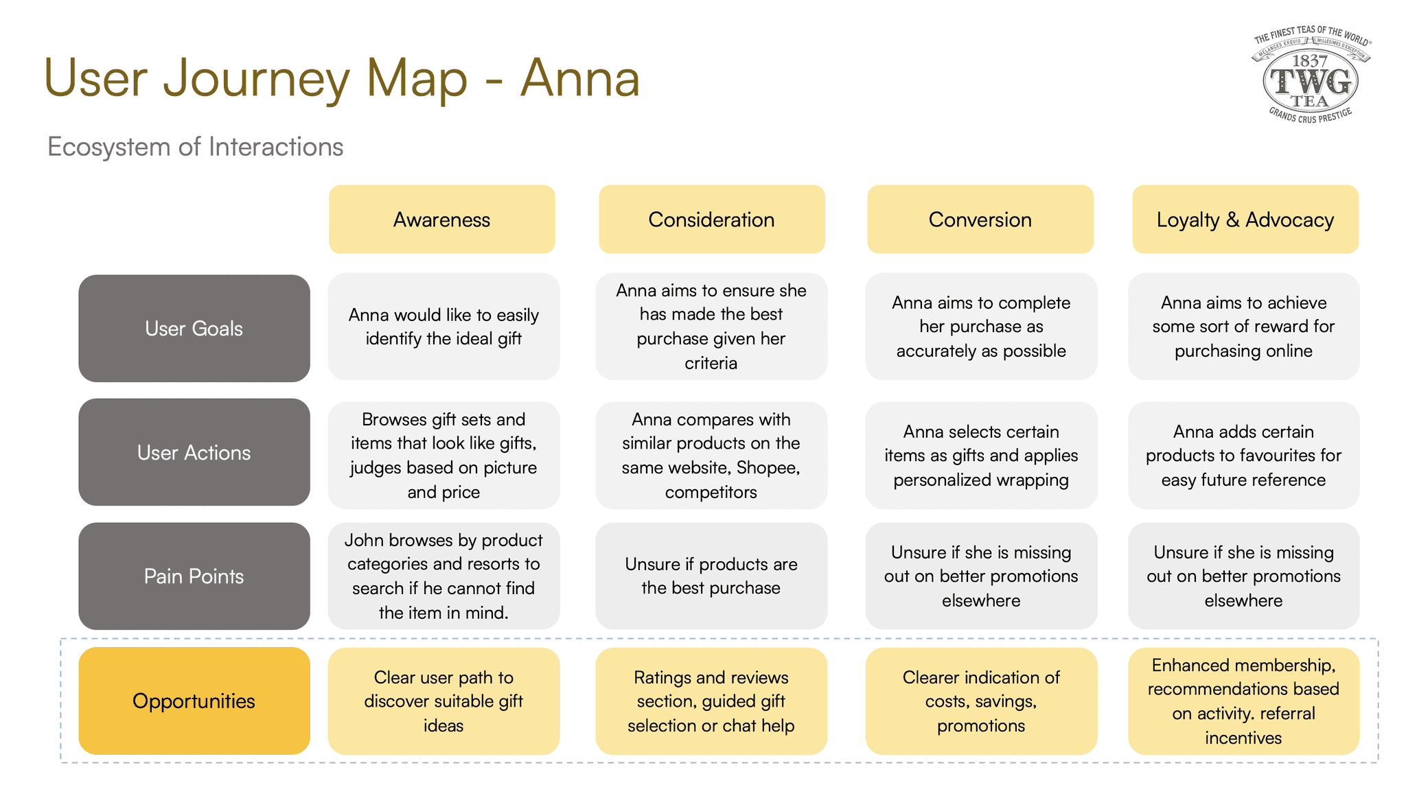 From our user research, we were able to derive two distinct user personas, 1) John who primarily purchases TWG Tea products for personal consumption on a regular basis and 2) Anna who purchases TWG Tea products for gifting purposes.