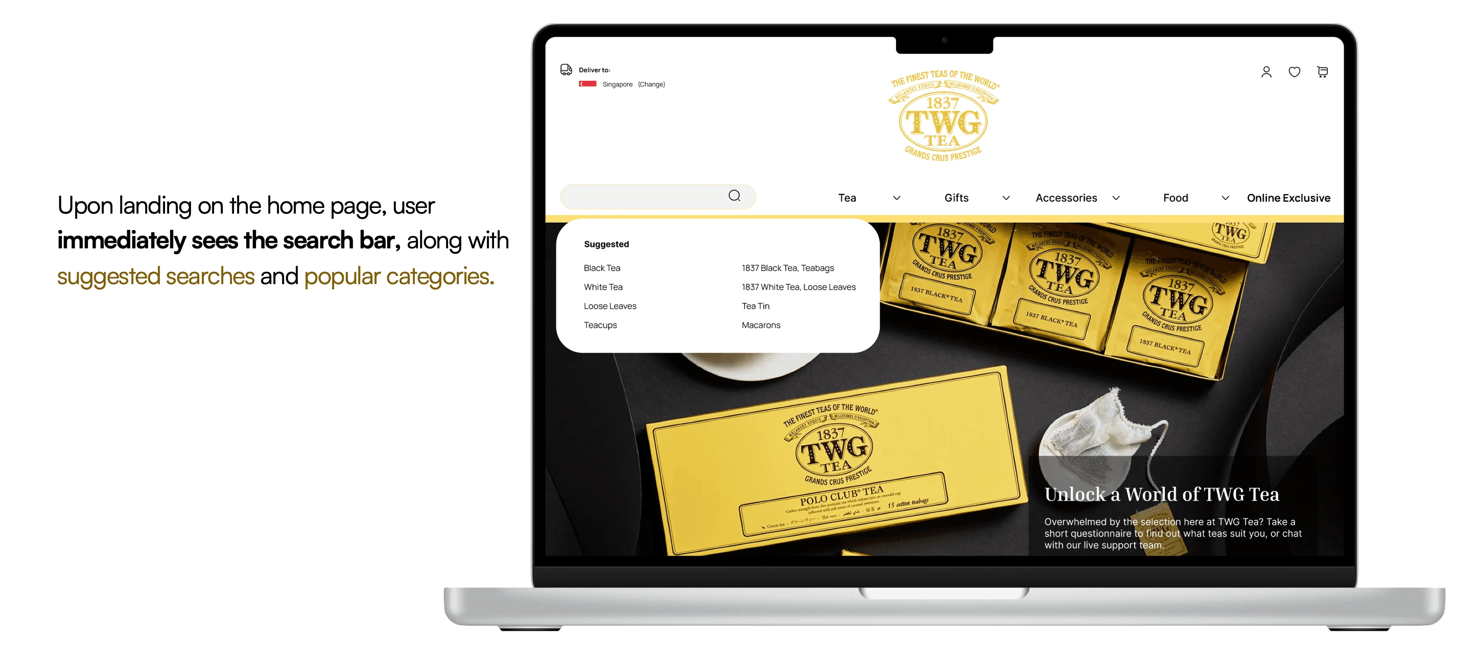 To further facilitate product discovery, the search bar would display suggested searches and popular categories when clicked. Placement of the search bar per the mockup, would be strategic such that users would easily notice it upon landing on the TWG website. This is consistent with the F-pattern for viewing, and was also validated through user testing.