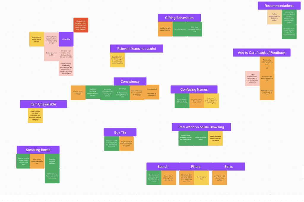 We also conducted open card sorting with our users to understand how they would naturally organise the variety of products available on TWG's website. This was extremely useful in revealing to us any disparities between the the way the website presented its categories with our users' mental models.