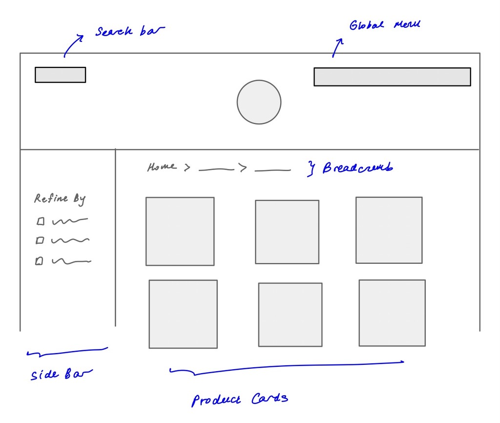 Competitor screens and user inputs helped to arrive at the final iteration of the product listings page, particularly the inclusion of the sidebar with the faceted navigation (refined categories and sort features), the use of breadcrumbs, as well as the number of products to display per page and row.