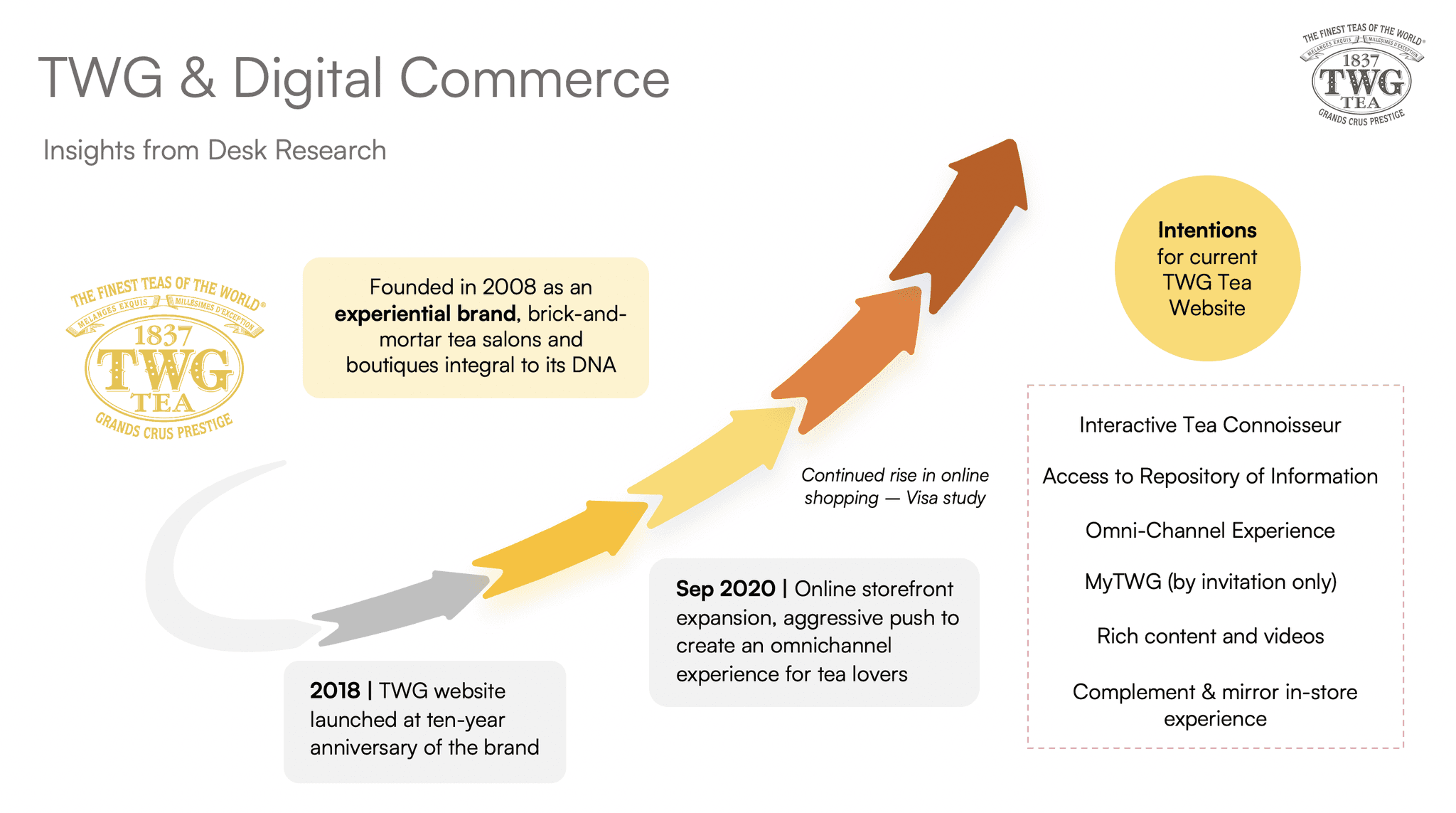 Before seeking our users' opinions, we first wanted to objectively understand the context and goals driving the launch of TWG's existing website. From our desk research, we learnt that apart from being a platform for online sales, the TWG website was meant to be an extension of its premium brand and experience. For instance, the website was intended to be an "interactive tea connoisseur", such that users would have access to rich content on TWG's tea blends and harvests without needing to visit an outlet physically.