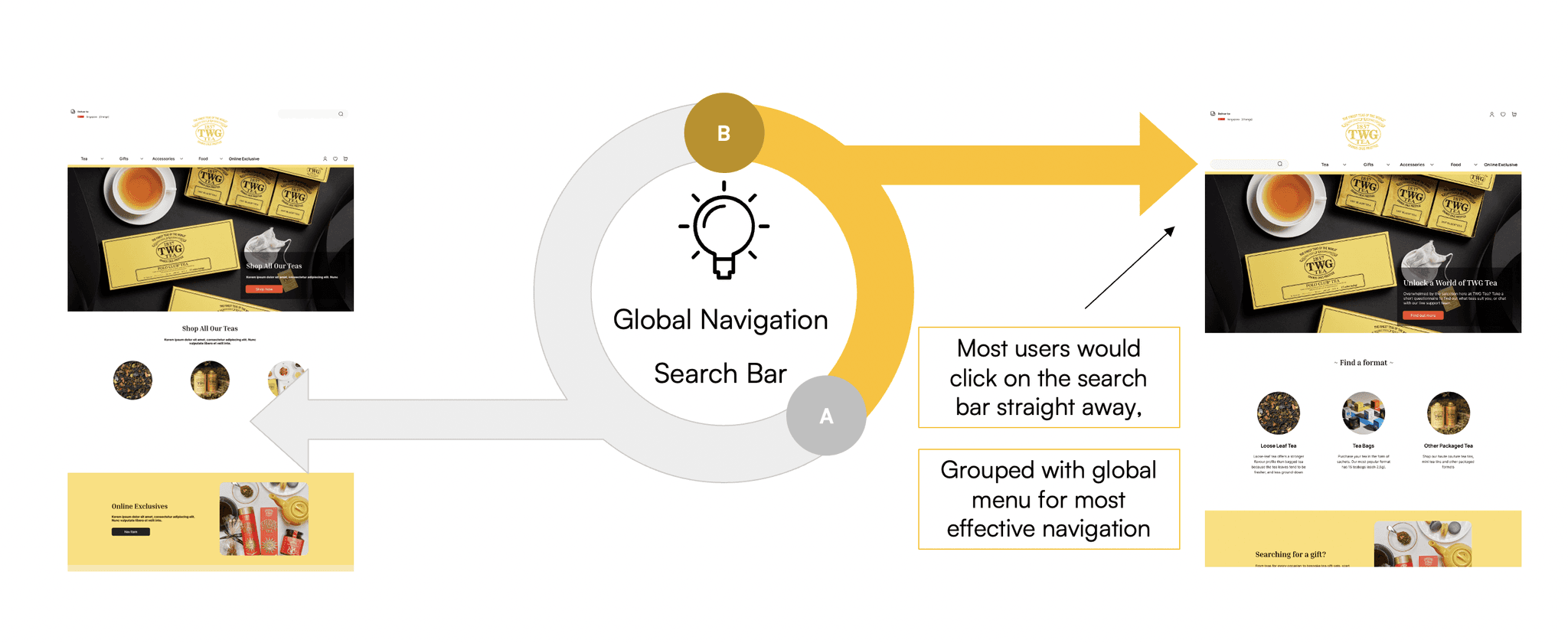 To further facilitate product discovery, the search bar would display suggested searches and popular categories when clicked. Placement of the search bar per the mockup, would be strategic such that users would easily notice it upon landing on the TWG website. This is consistent with the F-pattern for viewing, and was also validated through user testing.