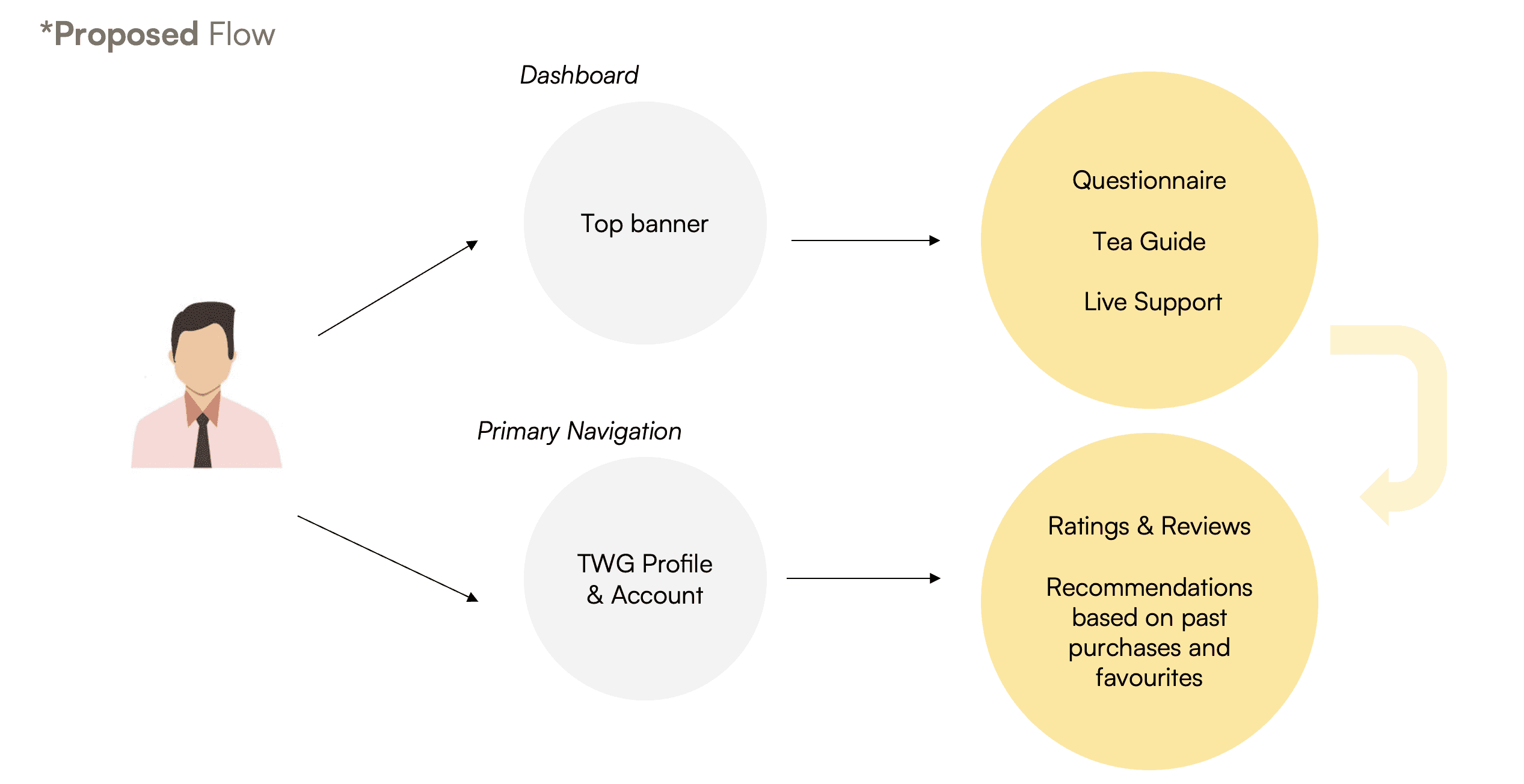 A user would be able to get generic recommendations right upon clicking the top banner CTA on the home page, which would lead him to resources such as the questionnaire, tea guide and live support. Alternatively, the user could login to his TWG profile and get more targeted recommendations given his purchase history and past interactions on the website.