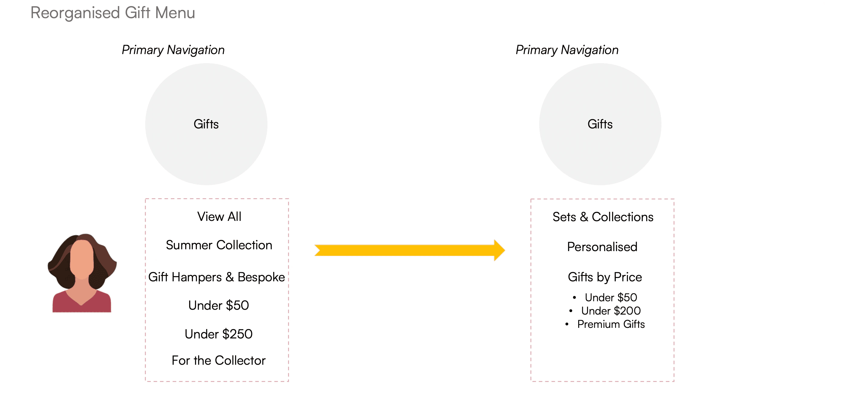 Our research also indicated that users who purchased tea products mainly for gifting were more conscious of aspects such as price, packaging and personalisation. While there was some degree of categorisation by price on the existing website ("Under $50" and "Under $200"), users were often confused by the number of subcategories under the Gifts section, such as "For the Collector" and "Summer Collection".